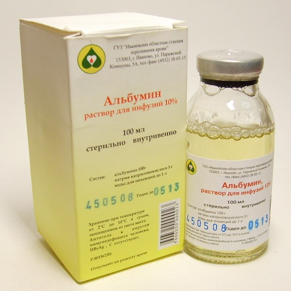 При начальных признаках анафилактической реакции или слишком быстром введении (головная боль, одышка, удушье) переливание альбумина необходимо сразу прекратить и, не вынимая иглы из вены, ввести соответствующие препараты (антигистаминные, кардиотонические средства, глюкокортикоиды, вазопрессорные препараты при наличии показаний).