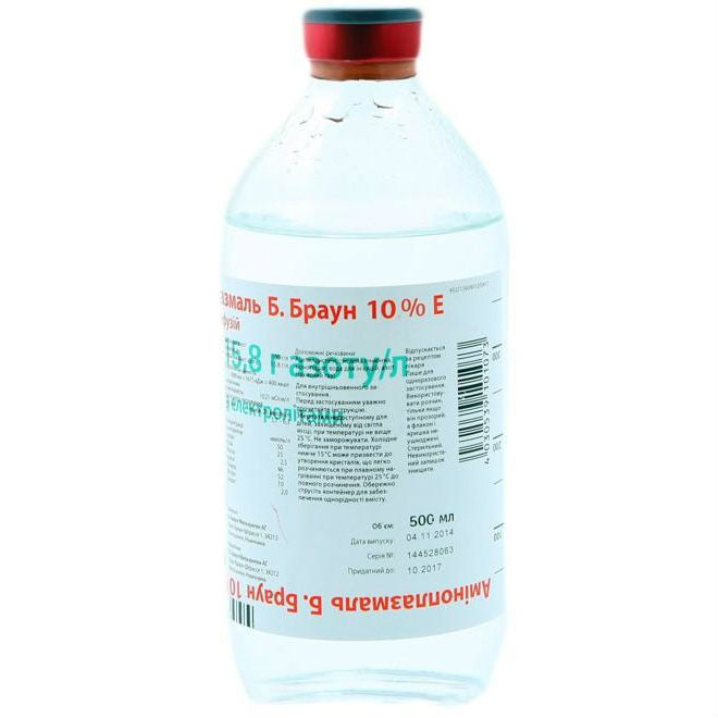 Основное терапевтическое воздействие Аминоплазмаля Б. Браун Е 10 заключается в снабжении организма субстратом синтеза белков при парентеральном питании.