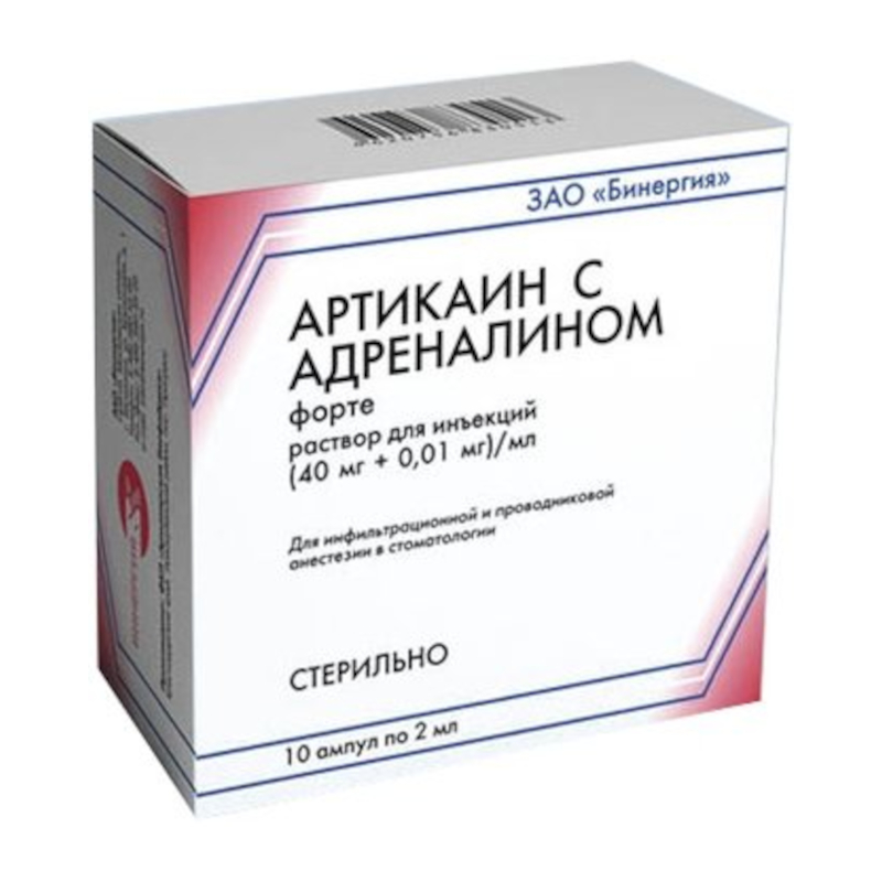 Артикаин с адреналином форте, применяемый для инфильтрационной и проводниковой анестезии в стоматологии, является комбинированным препаратом, в состав которого входит артикаин (местноанестезирующее средство амидного типа) и эпинефрин (сосудосуживающее средство), который добавляют в состав препарата для пролонгации анестезии.