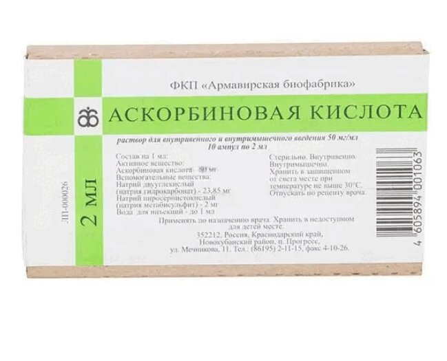 Аскорбиновая кислота 50 мг/мл раствор для внутривенного и внутримышечного введения 2 мл 10 шт Армавирская биологическая фабрика