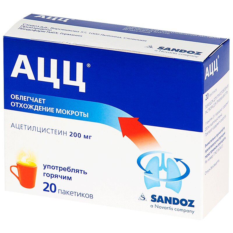Дети от 2 до 6 лет: по 1 пакетику АЦЦ® 100 мг или 1/2 пакетика АЦЦ® 200 мг 2–3 раза в день (200–300 мг в день).