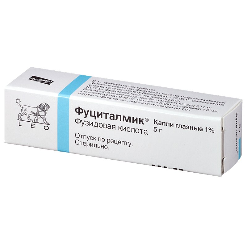 Через 1, 3, 6 и 12 ч после однократного применения Фуциталмика средняя концентрация фузидовой кислоты в слезной жидкости составляет 15.7; 15.2; 10.5 и 5.6 мкг/мл соответственно. Во внутриглазной жидкости концентрация фузидовой кислоты, равная 0.3 мкг/мл (после однократного применения) и 0.8 мкг/мл (после повторного применения), достигается в течение 1 ч после применения и поддерживается, по крайней мере, в течение 12 ч, при этом фузидовая кислота в сыворотке крови не определяется.