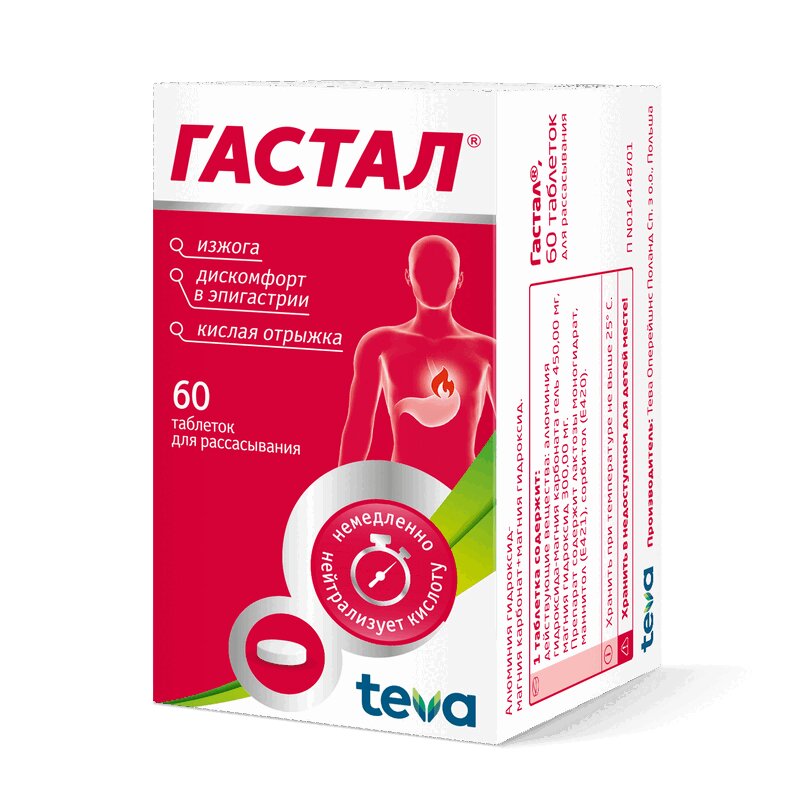 Алюминия гидроксида-магния карбоната гель и магния гидроксид обеспечивают немедленную (сразу же после приема) и продолжительную (около 2 ч) нейтрализацию соляной кислоты желудочного сока, с поддержанием кислотности в желудке на физиологическом уровне (pH 3-5). 1 таблетка препарата Гастал® нейтрализует около 21.5 ммоль соляной кислоты.