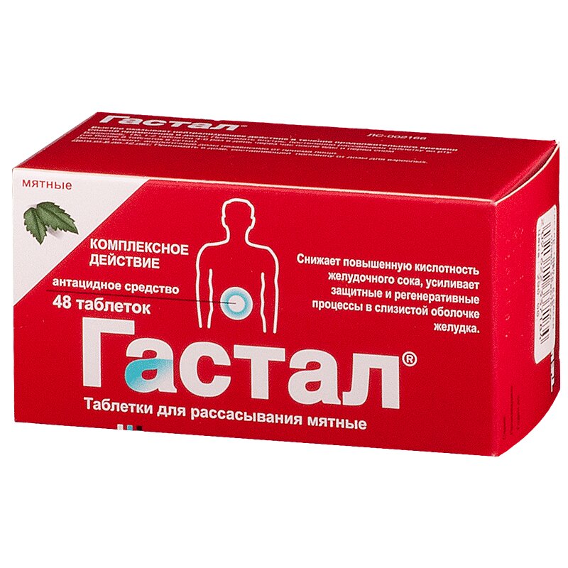 Антацидное действие препарата проявляется сразу после приема таблеток Гастала и продолжается около 2 ч. 1 таблетка Гастала нейтрализует около 21.5 ммоль соляной кислоты. Гастал ингибирует действие пепсина, лизолецитина и желчных кислот, таким образом, также устраняя расстройства функции желудка.