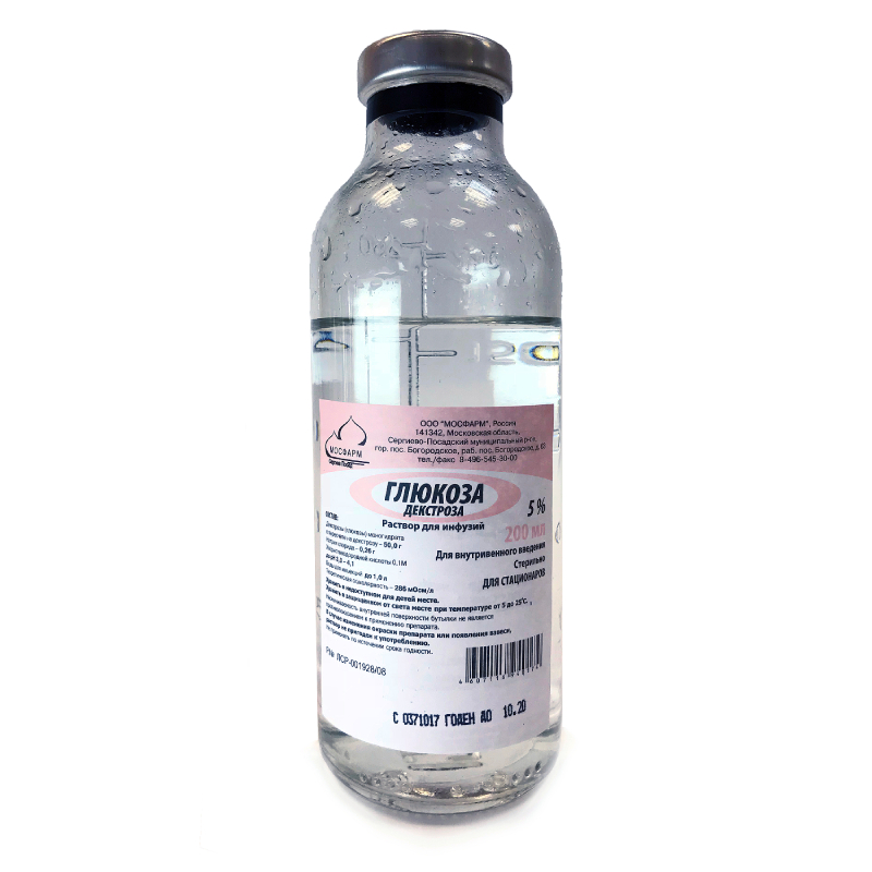 Для повышения осмолярности 5% раствор глюкозы можно комбинировать с раствором натрия хлорида. Более полно и быстро декстроза усваивается на фоне инсулина (3 ЕД на 1 г сухой декстрозы).