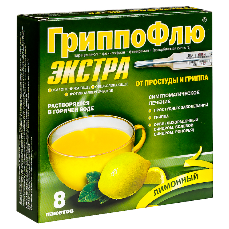 ГриппоФлю Экстра от простуды и гриппа порошок для приготовления раствора для приема внутрь Лимон 8 шт