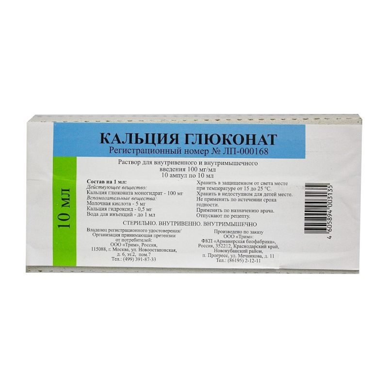 Кальция глюконат 100 мг/мл раствор для внутривенного и внутримышечного введения 10 мл 10 шт Армавирская биофабрика