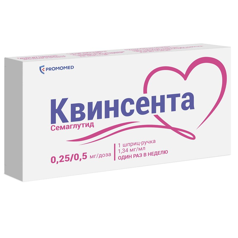 1. Для препарата Квинсента, раствор для п/к введения, 0,25/0,5 мг/доза в предварительно заполненной шприц-ручке позволяет вводить дозы 0,25 или 0,5 мг. Данная шприц-ручка предназначена для постепенного увеличения дозы от начальной — 0,25 мг и поддержания терапевтической дозы — 0,5 мг. Одна шприц-ручка содержит 1,5 мл раствора (2 мг семаглутида). Совместима с любыми иглами для шприц-ручек.