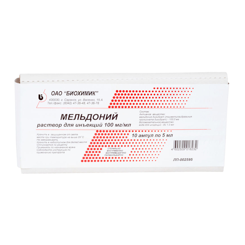 Инструкция по применению Мельдоний 100 мг/мл раствор для инъекций 5 мл 10 шт