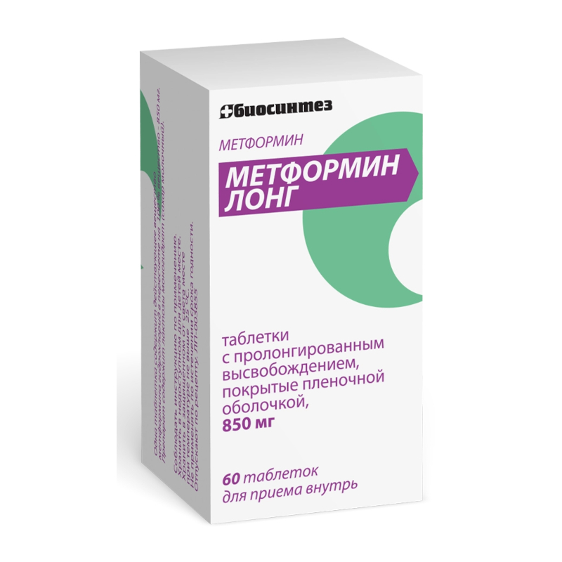 Метформин Лонг 850 мг таблетки покрытые пленочной оболочкой с пролонгированным высвобождением 60 шт Биосинтез