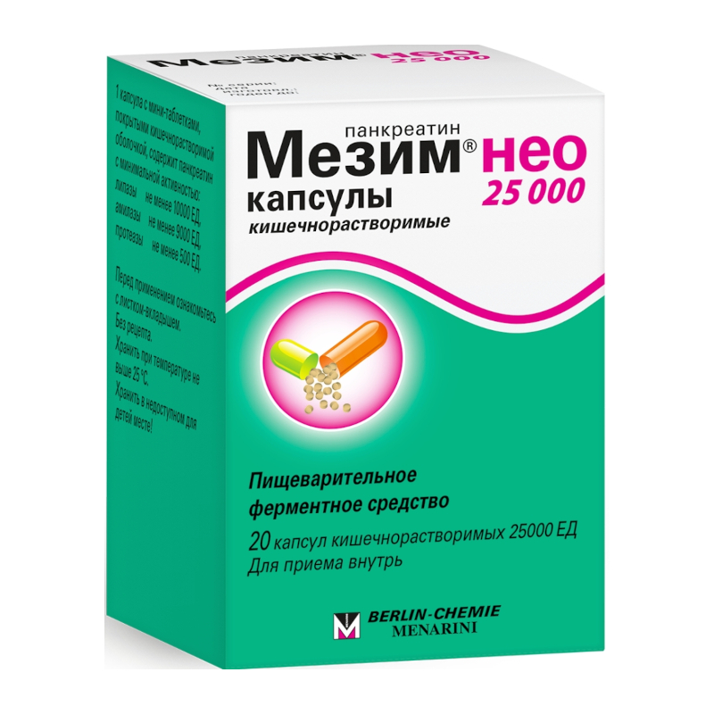Показания Желатиновые капсулы препарата Мезим® нео 25000 быстро растворяются в желудке, высвобождая минитаблетки, покрытые кишечнорастворимой (кислотоустойчивой) оболочкой. Таким образом, ферменты остаются защищенными от инактивации в кислой среде желудка. Форма выпуска препарата обеспечивает перемешивание мини-таблеток с кишечным содержимым и равномерное распределение ферментов. Растворение оболочки мини-таблеток и активация ферментов происходит при нейтральной или слабощелочной рН в тонкой кишке. Панкреатин не всасывается в ЖКТ, выводится с каловыми массами. Фармакологическое действие Действующим веществом препарата Мезим® нео 25000 является панкреатин, представляющий собой порошок из поджелудочных желез свиней. Ферменты, входящие в состав панкреатина, способствуют расщеплению жиров, углеводов и белков, поступающих с пищей. Панкреатин, оказывая протеолитическое, амилолитическое и липолитическое действие, компенсирует ферментативную недостаточность поджелудочной железы, улучшает функциональное состояние ЖКТ, нормализует процессы пищеварения. Лекарственное взаимодействие Исследований по взаимодействию не проводилось.