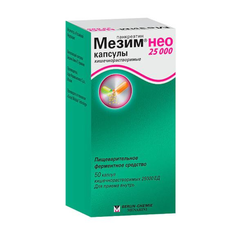 Действующим веществом препарата Мезим® нео 25000 является панкреатин, представляющий собой порошок из поджелудочных желез свиней. Ферменты, входящие в состав панкреатина, способствуют расщеплению жиров, углеводов и белков, поступающих с пищей. Панкреатин, оказывая протеолитическое, амилолитическое и липолитическое действие, компенсирует ферментативную недостаточность поджелудочной железы, улучшает функциональное состояние ЖКТ, нормализует процессы пищеварения.