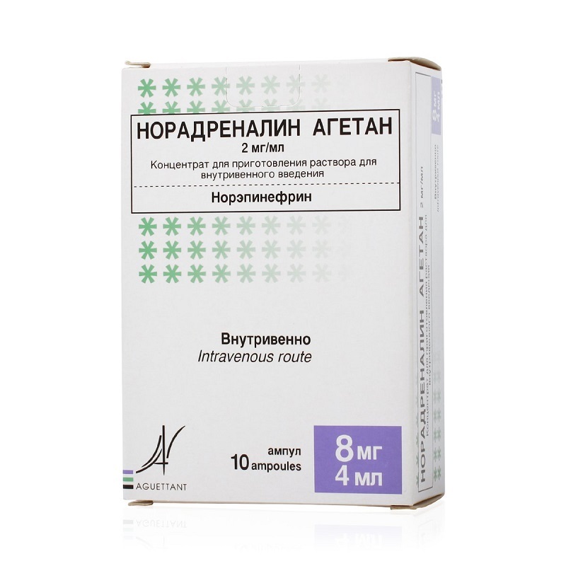 Инструкция по применению Норадреналин Агетан 2 мг/мл концентрат для приготовления раствора для инъекций 4 мл 10 шт