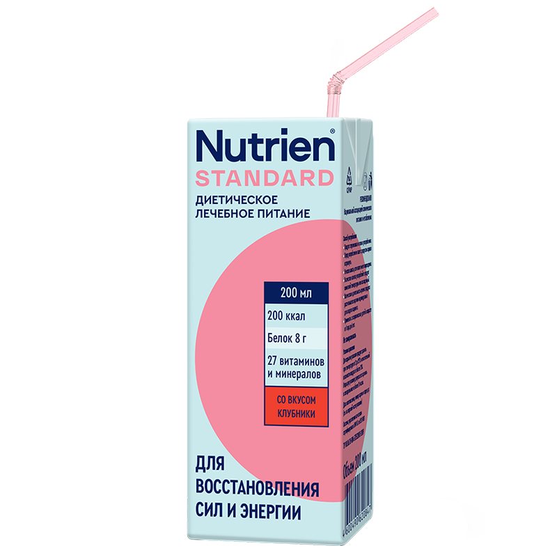 Специализированный продукт диетического лечебного и диетического профилактического питания жидкая высококалорийная смесь для энтерального питания «Нутридринк» со вкусом шоколада для ускорения восстановления в период лечения и реабилитации. Nutridrink – cбалансированный источник белка, энергии и необходимых нутриентов, помогает восстанавливать силы после болезни. Продукт предназначен для взрослых с недостаточностью питания или риском ее развития, возникающими при инсульте, травмах, инфекциях, хронической обструктивной болезни легких, хронических заболеваниях системы пищеварения, в пред- и послеоперационный период. Высококалорийный продукт содержит натуральные каротиноиды, витамины группы B, С, Е , D3 , К, фолиевую и пантотеновую кислоты, микроэлементы (хром, селен, медь) и минеральные вещества (натрий, калий, кальций, фосфор, магний, железо, цинк, марганец). В линейке представлено 4 вкуса для разнообразия рациона: ваниль, клубника, банан, шоколад. Может употребляться в качестве дополнительного или единственного источника питания. Клинически значимый эффект наступает при приеме не менее 21 дня1. Длительность приема не ограничена (1–3 упаковки в день как дополнение к диете, 5–7 упаковок в день как единственный источник питания, если иное не назначено врачом). Только для энтерального питания. Не использовать парентерально. Рекомендации по применению: • Может являться единственным источником питания • Употребляется перорально мелкими глотками или через трубочку в течение 20–30 минут • 1-3 упаковки в день как дополнение к диете, 5-7 упаковок в день как единственный источник питания, если иное не назначено врачом • Клинически значимый эффект наступает при приеме не менее 21 дня • Длительность применения не ограничена • Перед употреблением хорошо встряхнуть • Хранить в сухом месте при температуре от 5 до 25 °С. Вскрытую бутылку хранить закрытой в холодильнике не более 24 часов. Возраст: С 18 лет Показания к применению: • Состояние после перенесенного инсульта и период реабилитации • Восстановление и реабилитация после полученных травм • Инфекции. • Хроническая обструктивная болезнь легких. • Хронические заболевания системы пищеварения. • Пре- и послеоперационный период Ключевые особенности: • Полноценное, сбалансированное по составу, легкоусвояемое питание • Оптимальное содержание белка (~ 12 г в одной упаковке) • Содержит 13 витаминов и 15 минералов • Возможно применение у пациентов с диабетом (содержит 1,8 хлебные единицы в 100 мл) • Оптимальное соотношение жирных кислот Омега-6 : Омега-3 как 5:1 обеспечивает противовоспалительную и иммуномодулирующую защиту • Содержит натуральные каротиноиды, витамины группы B, С, Е и микроэлементы (хром, селен, медь), которые обеспечивают антиоксидантный эффект • Повышенное содержание холина в составе (55 мг/100 мл) способствует полноценной работе ЦНС, профилактике развития постинсультной депрессии и когнитивных нарушений , • Повышенное содержание железа (2,4 мг/100 мл) помогает восполнять суточную потребность организма, что способствует улучшению функциональных исходов, профилактике железодефицитной анемии, астении и нейрокогнитивных нарушений • Повышенное содержание цинка (1,8 мг/100 мл) способствует укреплению иммунитета, профилактики анемии и половой дисфункции2 • Повышенное содержание селен