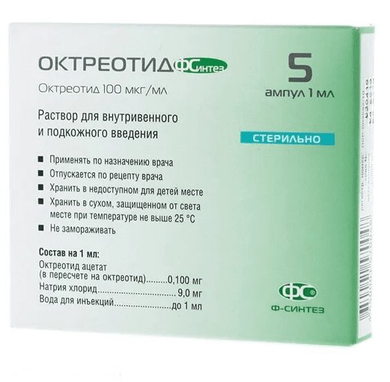 Октреотид раствор для внутривенного введения ампула 0,1 мг/ мл амп.1 мл 5 шт