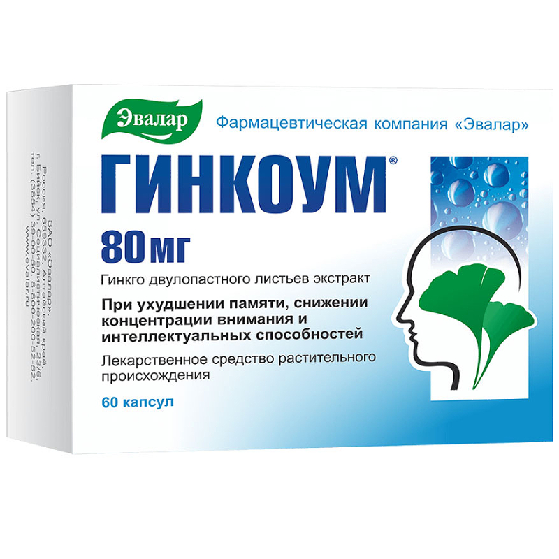 Гинкго билоба листьев экстракт: после приема внутрь биодоступность терпенлактонов (гинкголид А, гинкголид В и билобалид) составляет 80% для гинкголида А, 88% для гинкголида В и 79% для билобалида. Cmax в плазме - составляет 16-22 нг/мл для гинкголида А, 8-10 нг/мл для гинкголида В и 27-54 нг/мл для билобалида. Связывание с белками плазмы крови - 43% для гинкголида А, 47% для гинкголида В и 67 % для билобалида. T1/2 - 3.9 ч (гинкголид А), 4-6 ч (гинкголид В) и 2-3 ч (билобалид).
