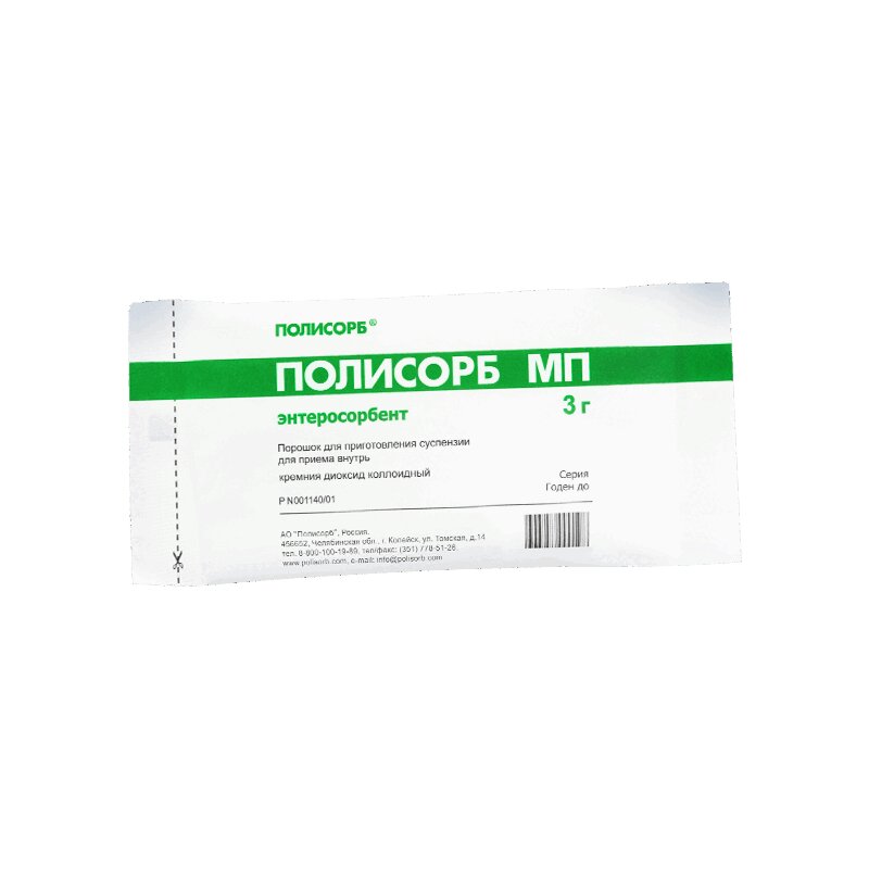 Полисорб® МП Полисорб (Россия) порошок для приготовления суспензии для приема внутрь; пакет (пакетик) одноразовый 3 г; код EAN: 4606257000198; № Р N001140/01, 2008-09-10 от Полисорб (Россия) Латинское название Polisorb MP Действующее вещество Кремния диоксид коллоидный(Silicii dioxydum colloidale) АТХ: A07B Адсорбирующие кишечные препараты Фармакологическая группа Энтеросорбирующее средство [Адсорбенты] Нозологическая классификация (МКБ-10) A05.9 Бактериальное пищевое отравление неуточненноеB19 Вирусный гепатит неуточненныйK59.1 Функциональная диареяK63.8.0* ДисбактериозN18 Хроническая почечная недостаточностьR17 Неуточненная желтухаT50.9 Другими и неуточненными лекарственными средствами, медикаментами и биологическими веществамиT50.9.0* Отравление алкалоидамиT51 Токсическое действие алкоголяT56.9 Токсическое действие металла неуточненногоT65.9 Токсическое действие неуточненного веществаT78.4 Аллергия неуточненнаяY57 Неблагоприятные реакции при терапевтическом применении других и неуточненных лекарственных средств и медикаментовY97 Факторы, связанные с загрязнением окружающей средыZ57 Профессиональная подверженность факторам рискаОписание лекарственной формы Легкий белый или белый с голубоватым оттенком порошок без запаха. При взбалтывании с водой образует взвесь. Фармакологическое действие Фармакологическое действие - адаптогенное, дезинтоксикационное, адсорбирующее. Фармакодинамика Полисорб® МП (медицинский пероральный) — неорганический, неселективный, полифункциональный энтеросорбент на основе высокодисперсного кремнезема с размерами частиц до 0,09 мм, с химической формулой SiO2. Сорбционная емкость препарата при внутреннем употреблении равна 300 м2/г. Полисорб® МП обладает выраженными сорбционными и детоксикационными свойствами. В просвете ЖКТ препарат связывает и выводит из организма эндогенные и экзогенные токсические вещества различной природы, патогенные бактерии и бактериальные токсины, антигены, пищевые аллергены, лекарственные препараты и яды, соли тяжелых металлов, радионуклиды, алкоголь. Полисорб® МП сорбирует также некоторые продукты обмена веществ организма, в т.ч. избыток билирубина, мочевины, холестерина и липидных комплексов, а также метаболиты, ответственные за развитие эндогенного токсикоза. Фармакокинетика Полисорб® МП не расщепляется и не всасывается в ЖКТ и выделяется в неизмененном виде. Показания препарата Полисорб® МП острые и хронические интоксикации различного происхождения у взрослых и детей; острые кишечные инфекции любого генеза, включая пищевые токсикоинфекции, а также диарейный синдром неинфекционного происхождения, дисбактериоз (в составе комплексной терапии); гнойно-септические заболевания, сопровождающиеся выраженной интоксикацией; острые отравления сильнодействующими и ядовитыми веществами, в т.ч. лекарственными препаратами и алкоголем, алкалоидами, солями тяжелых металлов; пищевая и лекарственная аллергия; гипербилирубинемия (вирусный гепатит и другие желтухи) и гиперазотемия (хроническая почечная недостаточность); жителям экологически неблагоприятных регионов и работникам вредных производств с целью профилактики. Противопоказания язвенная болезнь желудка и двенадцатиперстной кишки в фазе обострения; кровотечения из ЖКТ; атония кишечника; индивидуальная непереносимость препарата. Побочные действи