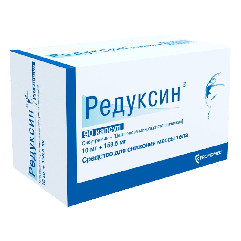 Капсулы голубого цвета для дозировки 10 мг + 158,5 мг. Содержимое капсул порошок белого или белого со слегка желтоватым оттенком цвета. Редуксин® — средство для лечения ожирения, которое помогает сформировать правильные привычки питания, уменьшить объем потребляемой пищи, а так же увеличивает внутренний расход энергии, что способсвует снижению массы тела. Сибутрамин является пролекарством и проявляет свое действие in vivo за счет метаболитов (первичные и вторичные амины), ингибирующих обратный захват моноаминов (серотонин, норадреналин и дофамин). Увеличение содержания в синапсах нейротрансмиттеров повышает активность центральных 5-НТ-серотониновых и адренергических рецепторов, что способствует увеличению чувства насыщения и снижению потребности в пище. МКЦ является энтеросорбентом, обладает сорбционными свойствами и неспецифическим дезинтоксикационным действием. Связывает и выводит из организма различные микроорганизмы, продукты их жизнедеятельности, токсины экзогенной и эндогенной природы, аллергены, ксенобиотики, а также избыток некоторых продуктов обмена веществ и метаболитов, ответственных за развитие эндогенного токсикоза.