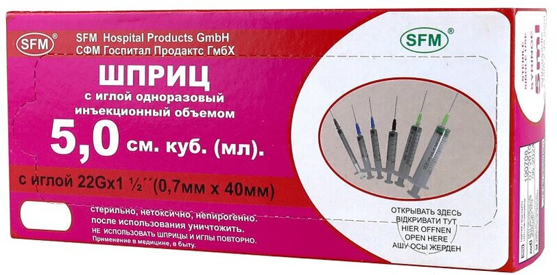 SFM Шприц одноразовый двухкомпонентный с иглой 22G 5 мл 100 шт