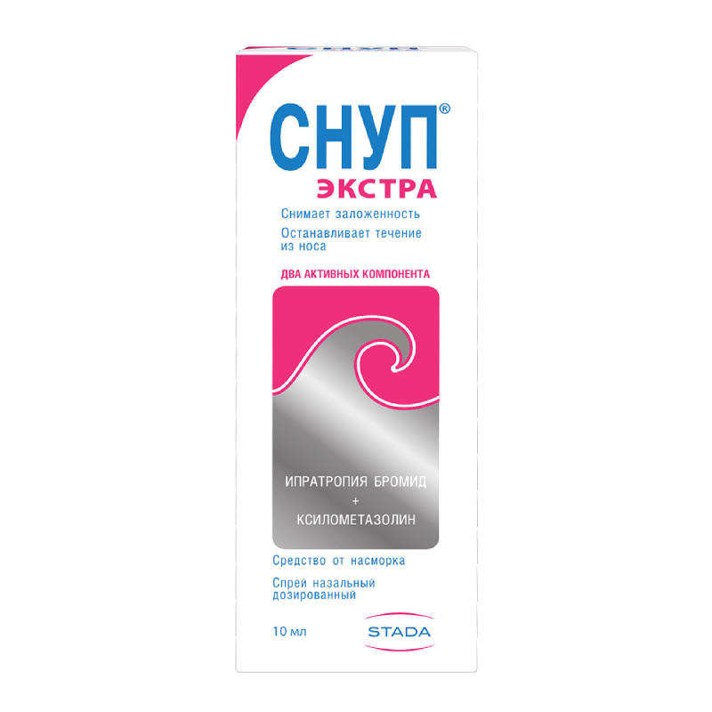 Одно впрыскивание Снуп® Экстра содержит около 70 мкг ксилометазолина гидрохлорида и 84 мкг ипратропия бромида.
