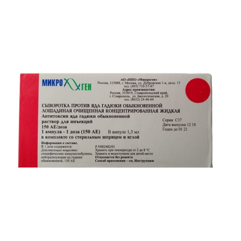 Инструкция по применению Сыворотка против яда гадюки 150 АЕ/доза раствор для инъекций 1,3 мл + шприц