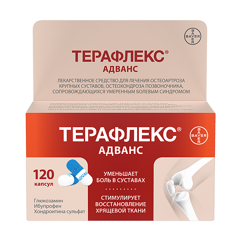 Терафлекс® Адванс представляет собой комбинированный препарат, содержащий в качестве активных компонентов хондроитина сульфат, глюкозамина сульфат и ибупрофен.