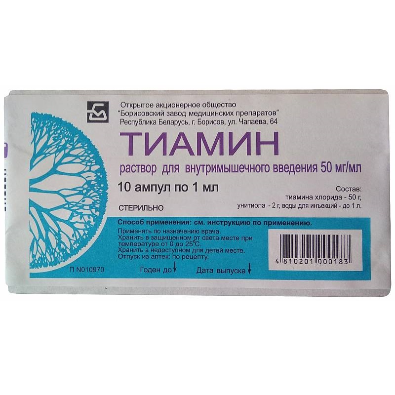 Тиамин 50 мг/мл раствор для внутримышечного введения 1 мл 10 шт Борисовский завод медицинских препаратов