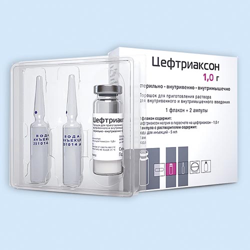 Цефтриаксон порошок для приготовления раствора для внутривенного и внутримышечного введения 1 г фл.1+р-ль (вода д/инъекций 5 мл) амп.2