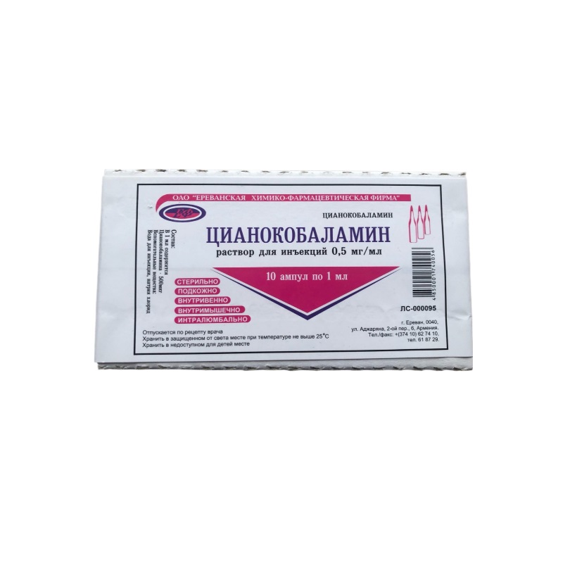 Внутрь, п/к, в/м, в/в и интралюмбально. При анемии Аддисона — Бирмера — по 100–200 мкг через день; при анемии Аддисона — Бирмера с явлениями фуникулярного миелоза и при макроцитарных анемиях с нарушениями нервной системы — по 500 мкг и более на инъекцию (в первую неделю — ежедневно, а затем — с интервалами между введениями до 5–7 дней). Одновременно назначают фолиевую кислоту. В период ремиссии при отсутствии явлений фуникулярного миелоза вводят для поддерживающей терапии по 100 мкг 2 раза в месяц, а при наличии неврологических явлений — по 200–400 мкг 2–4 раза в месяц. При железодефицитных и постгеморрагических анемиях — по 30–100 мкг 2–3 раза в неделю. При апластических анемиях (особенно у детей) — по 100 мкг до наступления клинико-гематологического улучшения. При алиментарной анемии у детей в раннем возрасте и у недоношенных — по 30 мкг в день в течение 15 дней; при болезнях ЦНС и неврологических заболеваниях с болевым синдромом вводят в возрастающих дозах от 200 до 500 мкг на инъекцию, а при улучшении состояния — по 100 мкг в день; курс — до 2 нед; при травматических поражениях периферических нервов — по 200–400 мкг через день в течение 40–45 дней. При гепатитах и циррозах печени — по 30–60 мкг в день или по 100 мкг через день в течение 25–40 дней; при дистрофиях у детей раннего возраста, болезни Дауна и детском церебральном параличе — по 15–30 мкг через день; при спру, лучевой болезни, диабетической нейропатии назначают по 60–100 мкг ежедневно в течение 20–30 дней. При фуникулярном миелозе, боковом амиотрофическом склерозе, рассеянном склерозе вводят иногда в спинномозговой канал по 15–30 мкг (увеличивая постепенно дозу до 200–250 мкг).