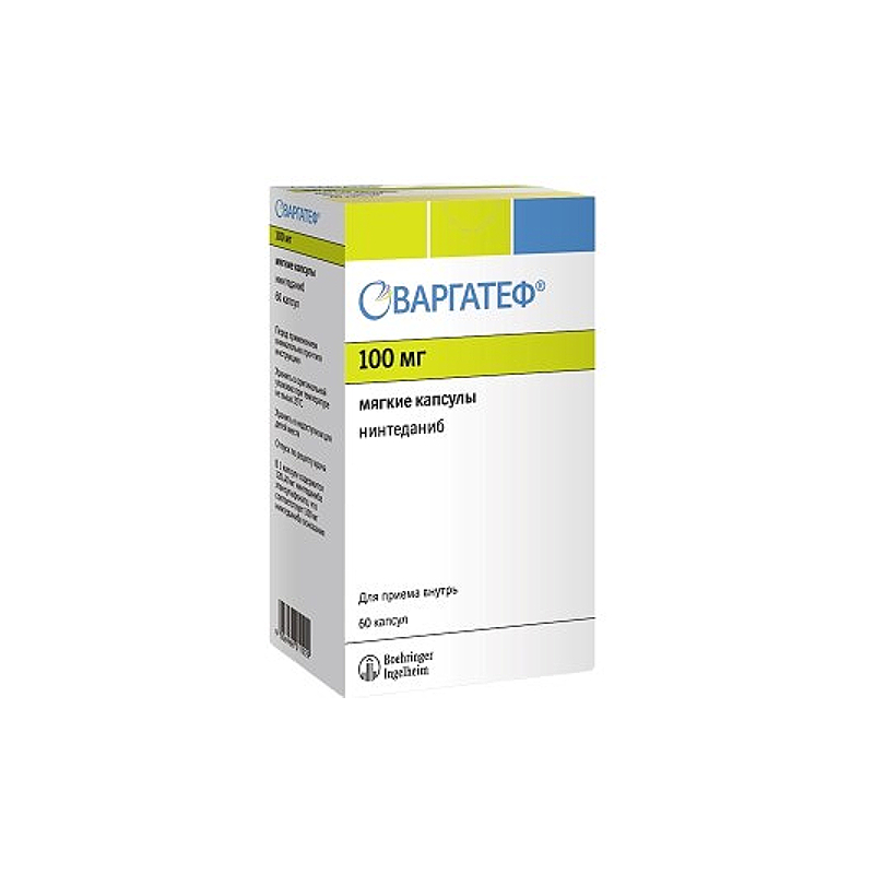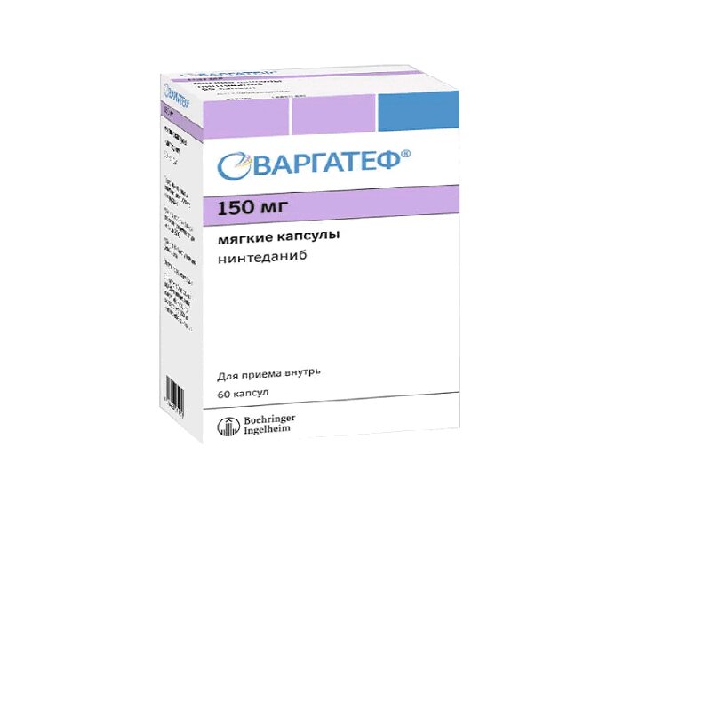 В исследовании INPULSIS у большего числа пациентов в группе препарата Варгатеф® развивался инфаркт миокарда (1.6%) по сравнению с группой плацебо (0.5%), в то время как нежелательные реакции в виде ИБС были сравнимы в группах нинтеданиба и плацебо. В исследованиях INBUILD и SENSCIS инфаркт миокарда встречался редко в группе пациентов, получавших препарат Варгатеф® - 0.9% по сравнению с 0.9% в группе плацебо в исследовании INBUILD; 0% по сравнению с 0.7% в группе плацебо в исследовании SENSCIS.
