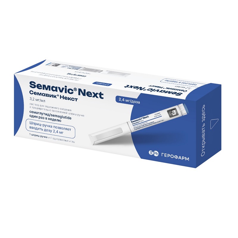 * в одной предварительно заполненной шприц-ручке содержится 2 мг семаглутида в 1.5 мл раствора препарата, что соответствует 4 дозам по 0.5 мг семаглутида.