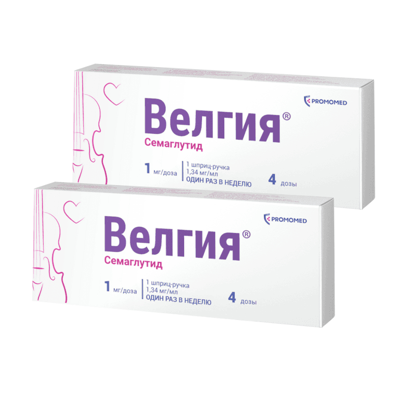 Велгия® – это препарат, содержащий действующее вещество семаглутид, который назначается в качестве дополнения к низкокалорийной диете и физической активности для коррекции и контроля массы тела. Семаглутид относится к средствам для лечения сахарного диабета; гипогликемическим средствам, кроме инсулинов. Семаглутид является аналогом природного гормона – глюкагоноподобного пептида-1 (ГПП-1), который выделяется после приема пищи и служит физиологическим регулятором углеводного обмена (уровня инсулина и глюкозы), а также аппетита и потребления пищи. Семаглутид воздействует на мишени (рецепторы) в головном мозге, которые контролируют аппетит, что помогает Вам быстрее почувствовать себя сытым, сохранить это ощущение надолго и снизить повышенную тягу к приему пищи. Также семаглутид затормаживает эвакуацию пищи из желудка, что дополнительно поддерживает длительное ощущение сытости. Такой механизм поможет Вам привыкнуть к правильному питанию и эффективно снизить массу тела. При приеме семаглутида наблюдаются дополнительные эффекты, такие как уменьшение окружности талии, улучшение обмена веществ (уровня липидов, глюкозы и др.), улучшение параметров сердечно-сосудистой системы (артериальное давление, пульс). Снижение массы тела на фоне приема семаглутида способствует уменьшению риска развития осложнений, связанных с наличием повышенной массы тела, в частности, сердечно-сосудистых заболеваний, сахарного диабета 2 типа (СД2), репродуктивных нарушений, заболеваний суставов, печени и др.