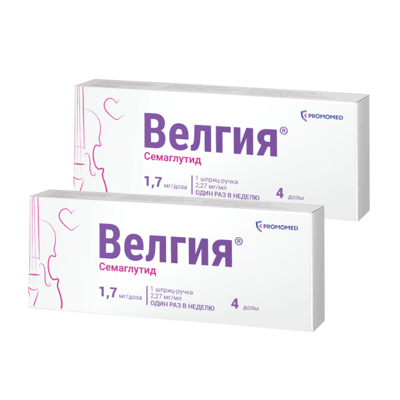 Велгия® – это препарат, содержащий действующее вещество семаглутид, который назначается в качестве дополнения к низкокалорийной диете и физической активности для коррекции и контроля массы тела. Семаглутид относится к средствам для лечения сахарного диабета; гипогликемическим средствам, кроме инсулинов. Семаглутид является аналогом природного гормона – глюкагоноподобного пептида-1 (ГПП-1), который выделяется после приема пищи и служит физиологическим регулятором углеводного обмена (уровня инсулина и глюкозы), а также аппетита и потребления пищи. Семаглутид воздействует на мишени (рецепторы) в головном мозге, которые контролируют аппетит, что помогает Вам быстрее почувствовать себя сытым, сохранить это ощущение надолго и снизить повышенную тягу к приему пищи. Также семаглутид затормаживает эвакуацию пищи из желудка, что дополнительно поддерживает длительное ощущение сытости. Такой механизм поможет Вам привыкнуть к правильному питанию и эффективно снизить массу тела. При приеме семаглутида наблюдаются дополнительные эффекты, такие как уменьшение окружности талии, улучшение обмена веществ (уровня липидов, глюкозы и др.), улучшение параметров сердечно-сосудистой системы (артериальное давление, пульс). Снижение массы тела на фоне приема семаглутида способствует уменьшению риска развития осложнений, связанных с наличием повышенной массы тела, в частности, сердечно-сосудистых заболеваний, сахарного диабета 2 типа (СД2), репродуктивных нарушений, заболеваний суставов, печени и др.