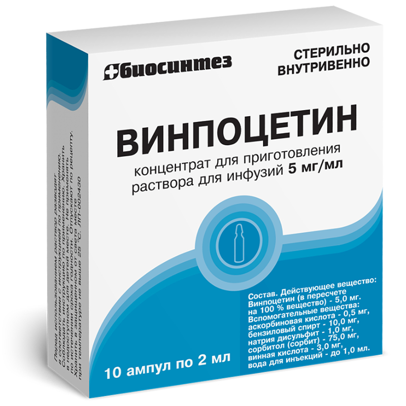 Винпоцетин 5 мг/мл концентрат для приготовления раствора для инфузий ампула 2 мл 10 шт Биосинтез