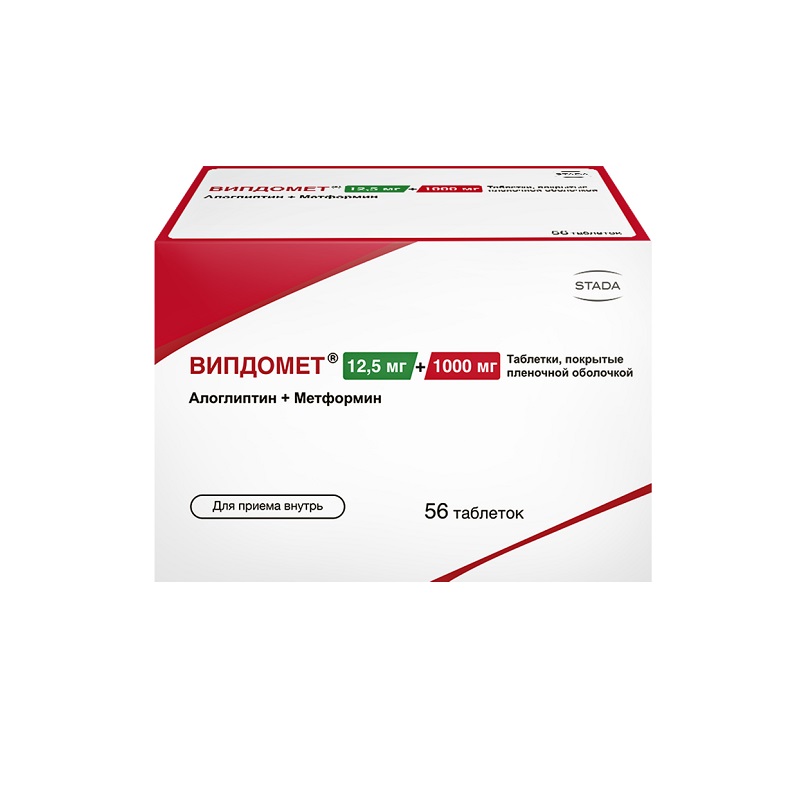 Препарат Випдомет® представляет собой комбинацию двух гипогликемических средств с взаимодополняющими и разными механизмами действия, предназначенную для улучшения контроля гликемии у пациентов с сахарным диабетом 2 типа (СД2): алоглиптина, ингибитора фермента дипептидилпептидазы-4 (ДПП-4), и метформина, представителя класса бигуанидов.