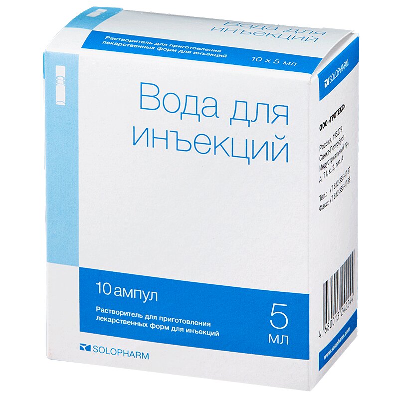 Показания Растворение и разведение лекарственных препаратов для их парентерального (инъекционного/инфузионного) введения непосредственно перед применением. Применяется с целью приготовления стерильных инфузионных и инъекционных растворов из порошков, лиофилизатов и концентратов. Фармакологическое действие Вода для инъекций не обладает фармакологической активностью. Используется в качестве растворителя, предназначена для приготовления инфузионных и инъекционных растворов, обеспечивая оптимальные условия для совместимости и эффективности субстратов и воды. Вода является основой различных трансфузионных препаратов, биологических тканей и жидкостей (кровь, лимфа, плазма клеток и др.), необходима для обменных процессов. В нормальных условиях вода выделяется с мочой, с калом, с потом и при дыхании. Потеря жидкости с потом, при дыхании и с каловыми массами происходит независимо от введения жидкости. Поддержание адекватной гидратации требует 30-45 мл/кг/сут воды у взрослых; у детей - 45-100 мл/кг, а у грудных детей - 100-165 мл/кг. Лекарственное взаимодействие При смешивании с другими лекарственными препаратами (инфузионные растворы, концентраты для приготовления инфузионных растворов, инъекционные растворы, порошки, сухие вещества для приготовления инъекционных растворов) необходим визуальный контроль на совместимость (может иметь место фармацевтическая несовместимость).