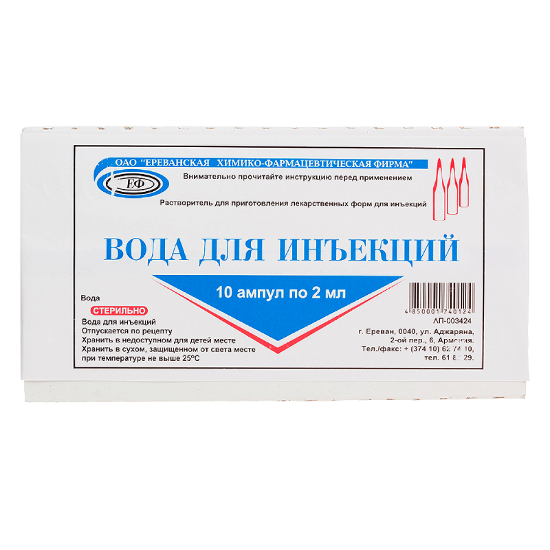 Вода для инъекций растворитель для приготовления лекарственных форм ампула 2 мл 10 шт Ереванская химико-фармацевтическая фирма