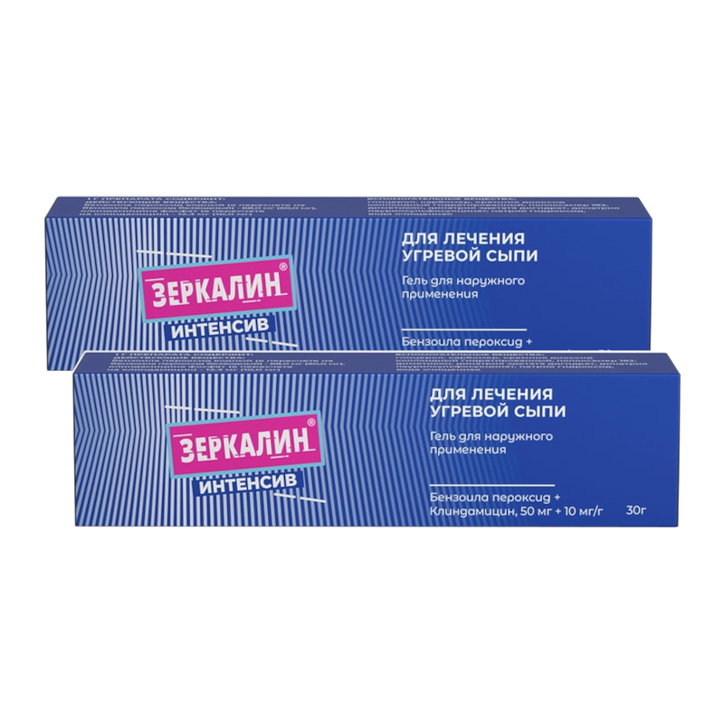 Зеркалин Интенсив - комбинированный препарат клиндамицина и бензоила пероксида для лечения акне легкой и умеренной степени тяжести, особенно с преобладанием воспалительных элементов сыпи. Клиндамицин останавливает размножение бактерий, приводящих к воспалению при акне, оказывает противовоспалительное действие и способствует снижению комедонов. Бензоила пероксид облегчает удаление излишка ороговевших клеток кожи, способных приводить к закупорке пор, а также вызывает гибель бактерий и препятствует появлению устойчивых к клиндамицину микроорганизмов.